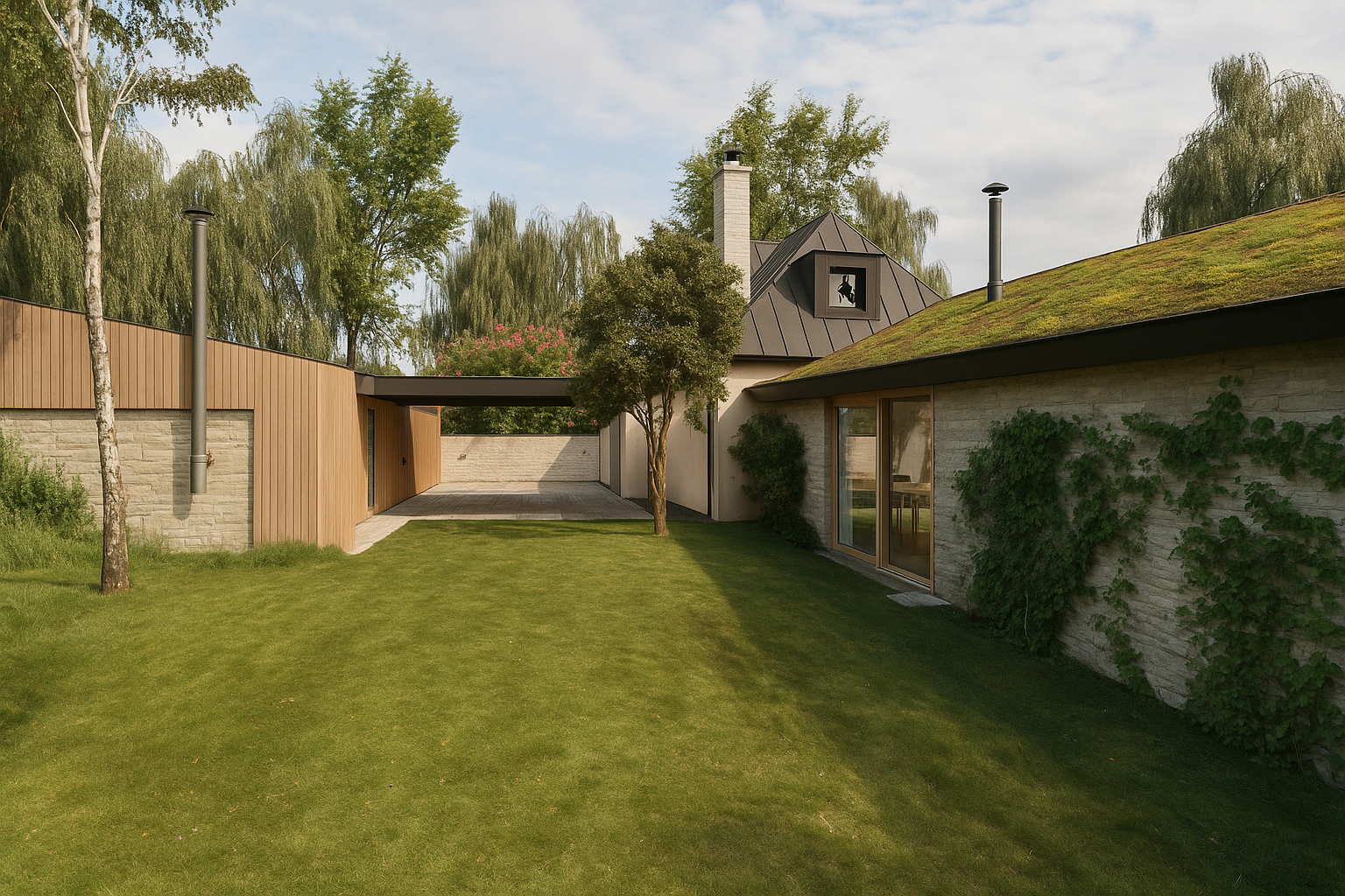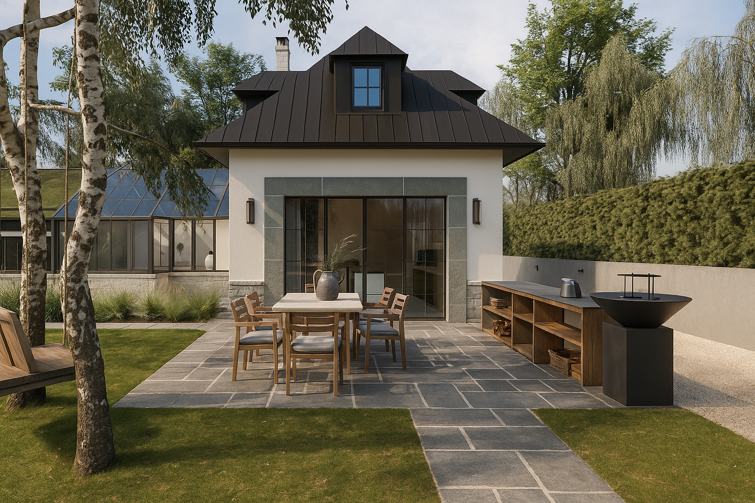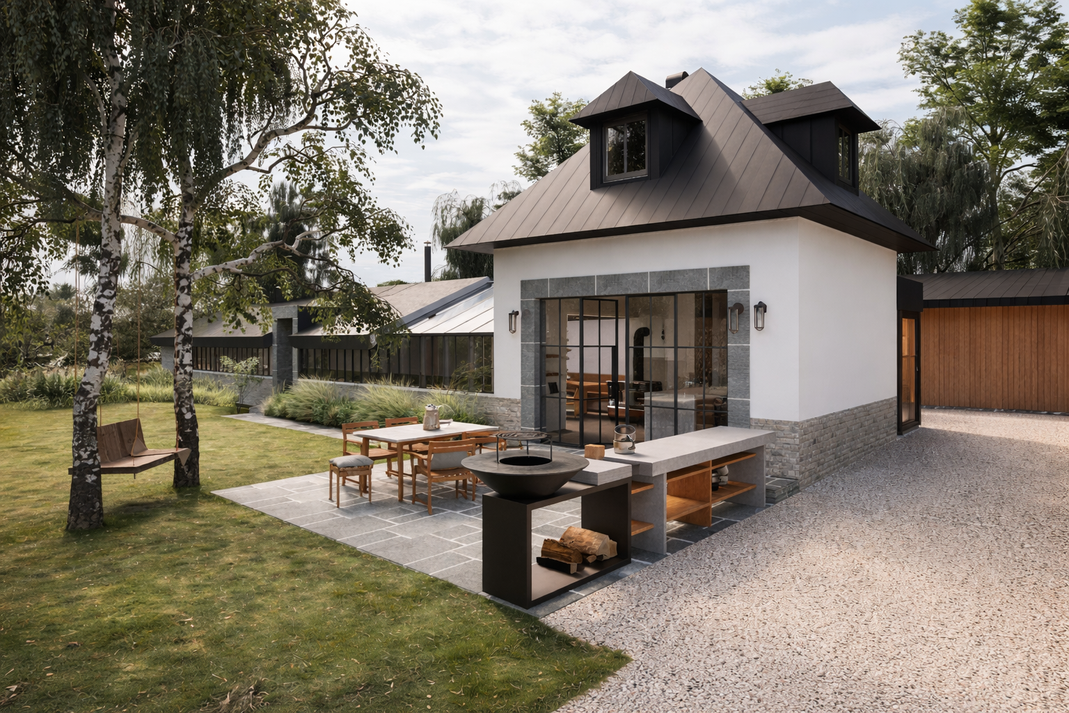 new glass house design with outdoor kitchen and relaxation area.
